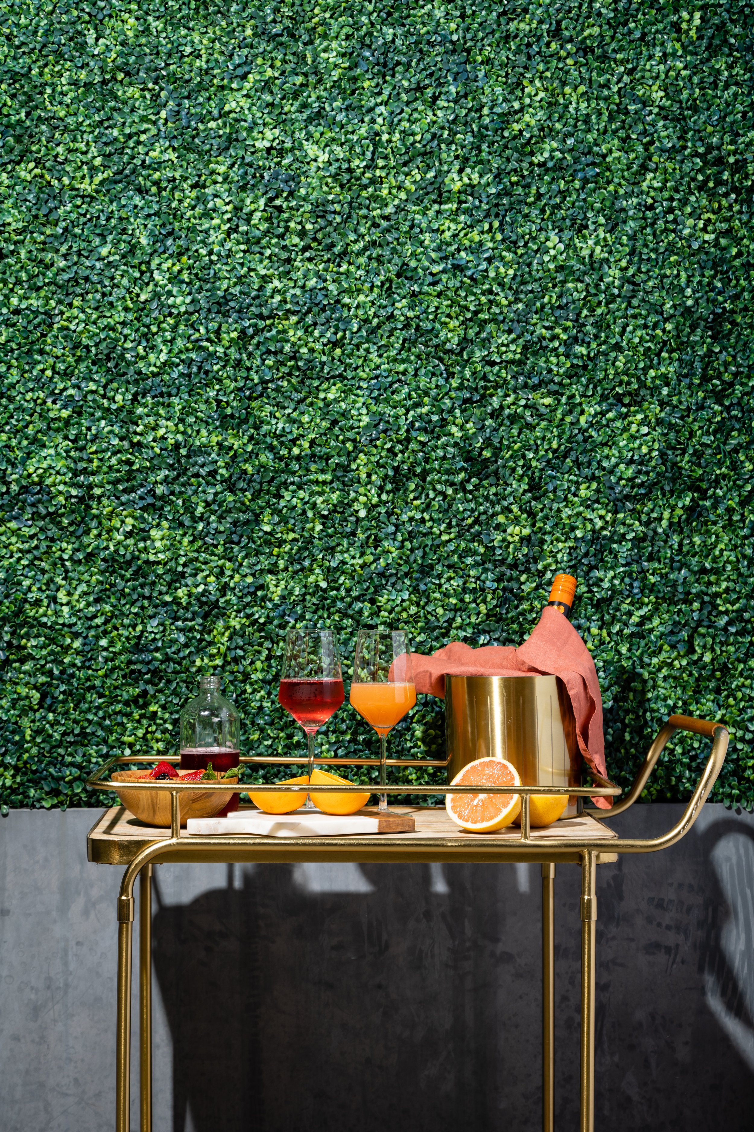 Cocktail Photography of Saint Elle's Signature Mimosa Bar against their greenery wall at Saint Elle event venue in Nashville, TN