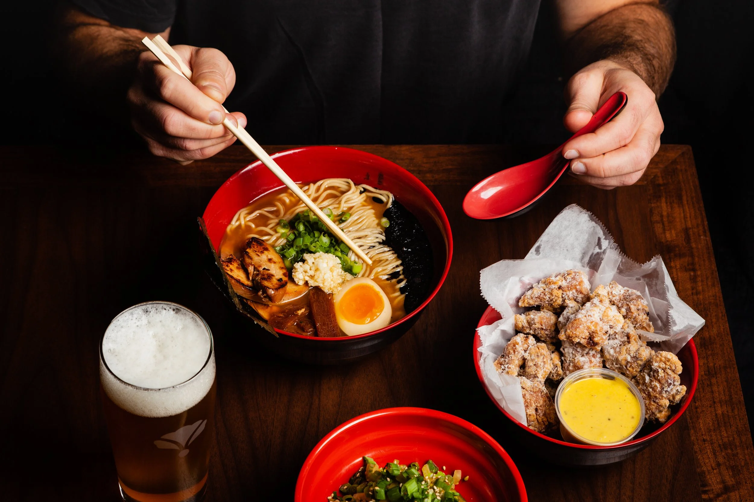Dark and Moody Food Photography of Ramen Bowls in Black Dynasty Secret Ramen House in Nashville, TN View fullsize